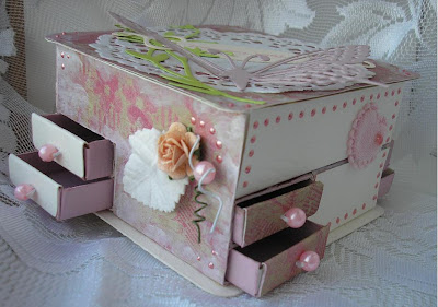 Рассказываю, что было в прошлый четверг: сын сдал последний экзамен и внезапно решил съездить к бабушке до вручения аттестата - т.е. на неделю раньше, чем планировали. И вечером накануне отъезда: "Мам, а мы Тане подарок не купили!" Таня - это сестра мужа, она лет на десять младше меня и примерно на столько же старше Сережи - в общем, отлично ладит с обоими поколениями) Я ей и так не собиралась ничего покупать, потому что планировала подарок сделать. Но еще не сделала, рассчитывая на предстоящие выходные. Без подарка - никак. Какой презент делать - было придумано тысячи лет назад, вот такой комодик для девушки - думаю, в самый раз) Девушка любит бабочек и розовый цвет - это всегда держу в голове. А еще она тоже понемногу занимается творчеством и в прошлую нашу встречу жаловалась, что постоянно теряет все маленькие материальчики))) В общем я, несмотря на свои ежедневные обещания при любых обстоятельствах ложиться спать не позже одиннадцати, в половине девятого вечера резво побежала искать спичечные коробки в нашей квартире с плитой со встроенными электрозажигалками. Нашла - спасибо хомяку, запихнувшему пустые коробки еще год назад в одну из своих норок) Творила до полчетвертого утра, только легла спать - и без четверти пять подъем. Фотографировала на ходу, хорошо что солнце в 5 уже встало!) А в шесть сын уже отъехал от вокзала, и вечером вручил подарок почти за полтысячи километров от места его создания) А я весь день с нетерпением ждала вечера, чтоб хоть на фотках посмотреть, что я там сотворила - делала при свете настольной лампы и с закрывающимися глазами - и честно- сама не помнила, что получилось в результате.