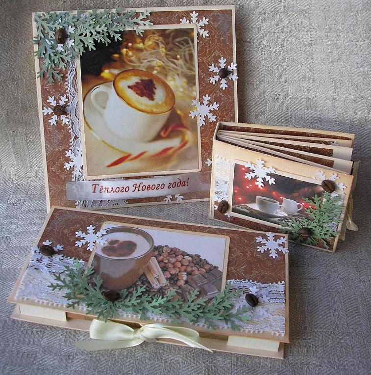 Я уже давно-давно показывала кофейно-новогоднюю шоколадницу и открыточку, а вообще это набор из трех предметов:
