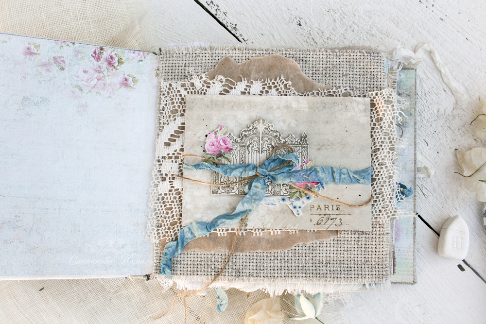 Обложка обтянута тонким льном и декорирована цветами, вырезанными из ткани, кружевным полотном...