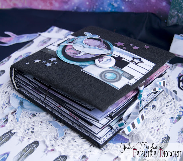 На первом развороте есть окошечко в космос - шейкер со звездами, звездной пылью и плавающим китом. В альбоме много открывающихся элементов, которые вы сможете рассмотреть на видео в конце поста.