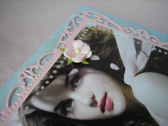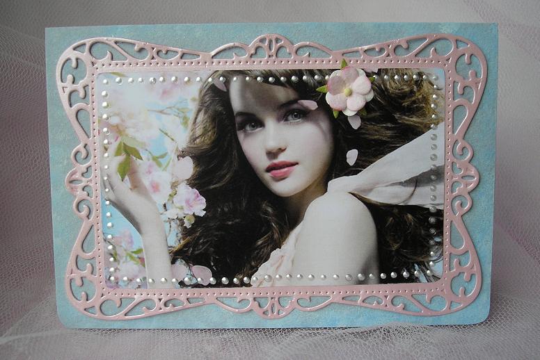 Основа - бумага для пастели, немного подкрашенная по краям акрилом. Вырубка из перламутрового картона. Картинка из Интернета. Рамочка по краю жидким жемчугом. И единственная объемная деталь - цветочек в волосах. Внутри из обычной розовой бумаги такая же вырубка для самых теплых слов)