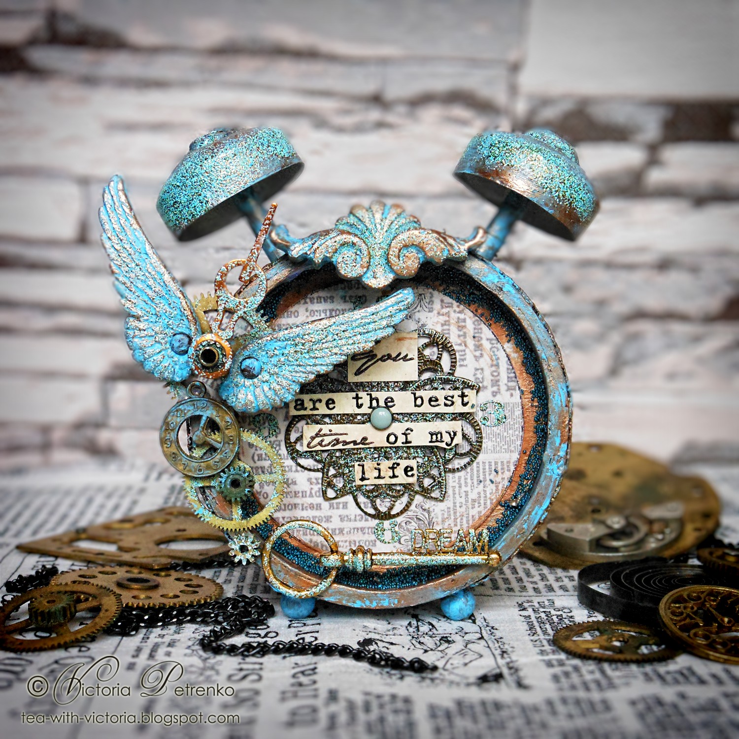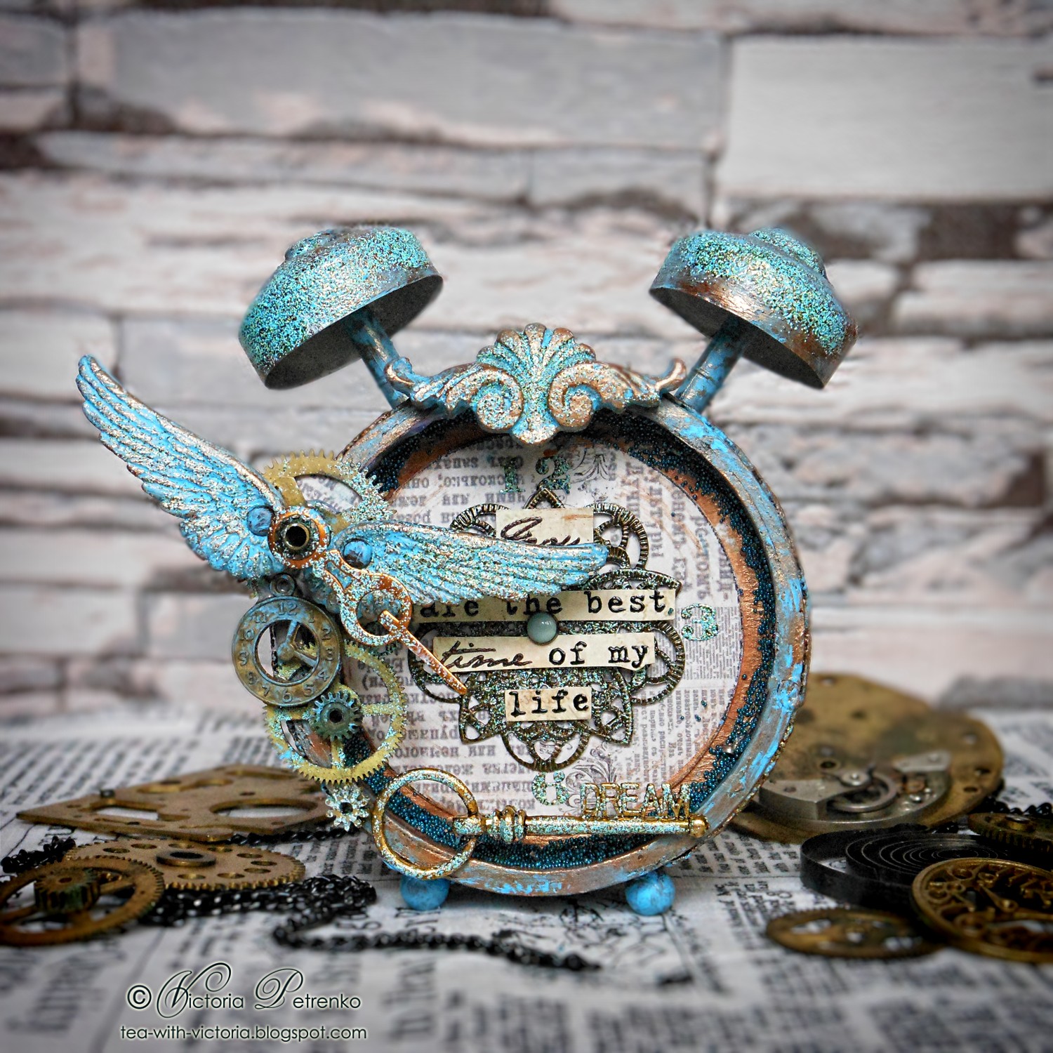 Новый будильничек из бобины от скотча, лепнины, подвесок и шестеренок. Много красок и пудры для эмбоссинга (пыталась создать эффект окислившегося металла).. Как делать такую конструкцию, показывала здесь :)