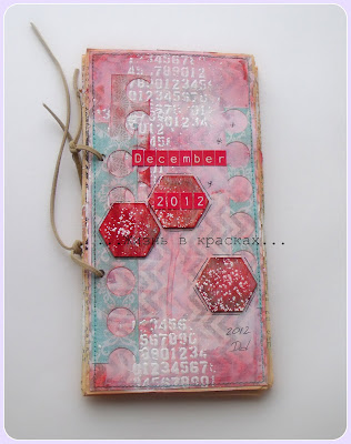 Ткань - американский хлопок. Для украшения обложки использовала деревянное украшение и топс Prima Marketing, а также изящную чипборд рамочку, которую покрыла краской с блеском Art Anthology.