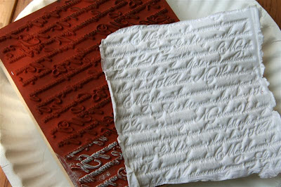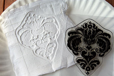 Намочите один листик туалетной бумаги и накройте им штампик, пальцами осторожно вдавите в рельеф штампика, затем продолжайте накрывать остальными листиками, один за другим, когда уложите все, накройте кухонными полотенцами и выдавите воду, как можно хорошо, можете повторить еще несколько раз.