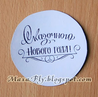 Венок я делала таким способом. Для начала из обычной белой бумаги, которую для прочности я приклеила на картон, вырезала круг (не обязательно идеально ровный) с новогодним поздравлением (у меня была распечатка, а можно поставить штамп).