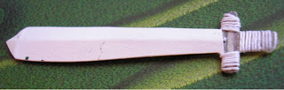 Мне все-таки не давала покоя пленка, которая при нагревании "обтягивает" предмет. Я понимаю, что такой фольги у меня нет. Но у меня же есть конфетные фантики из мягкой фольги! Может, подойдут? УзнАю только если проверю. Для рыцарских доспехов нужен меч. Я склеила такой вот непростой картонный: