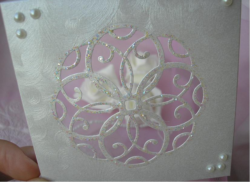 Материалы почти те же, только вместо бисера - микробисер, вместо полужемчужин - жидкий жемчуг. Другой нож для вырубки - с окошечком. А в окошечке дырокольная бабочка) Цвет - белый+розовый.