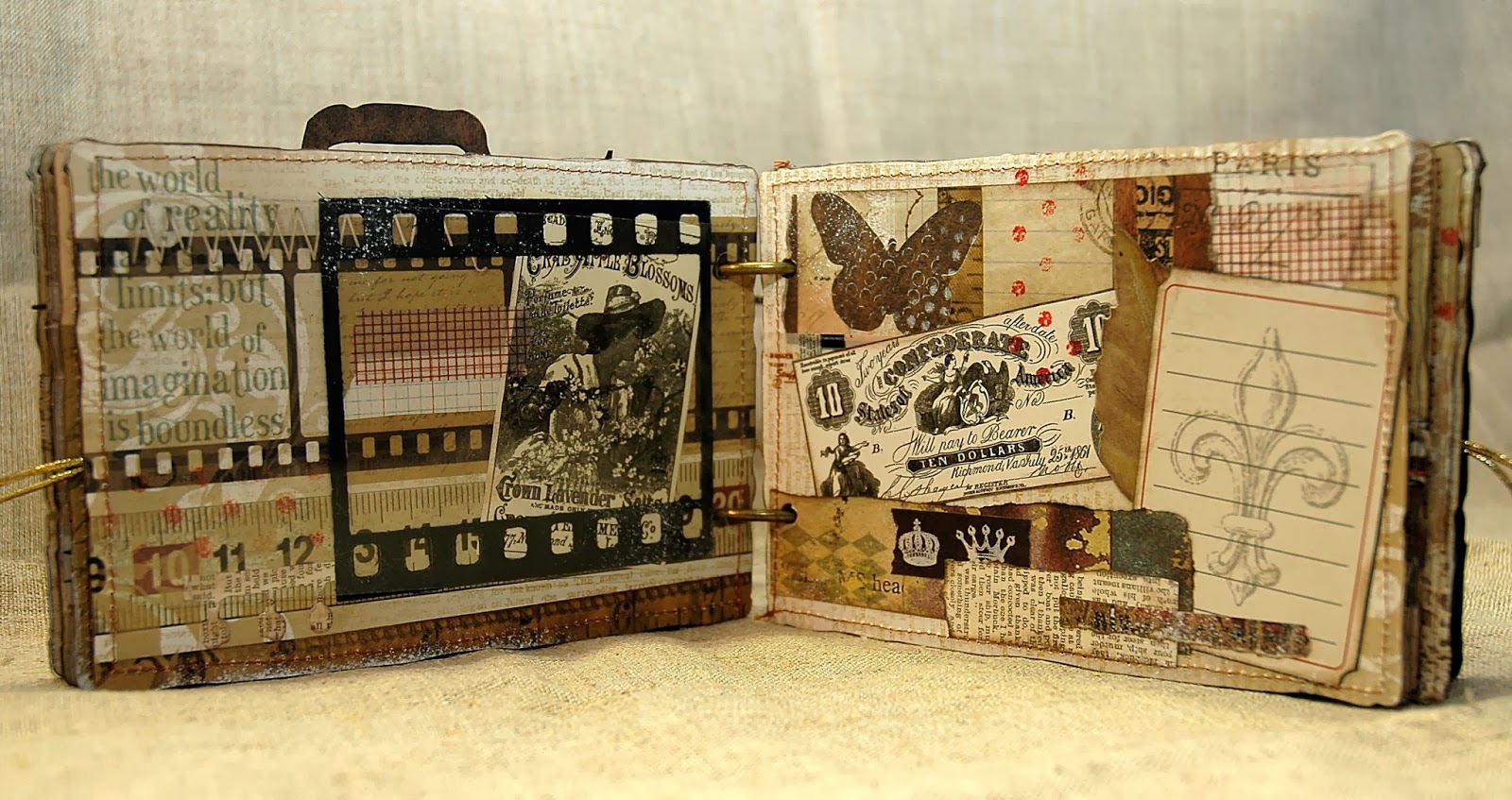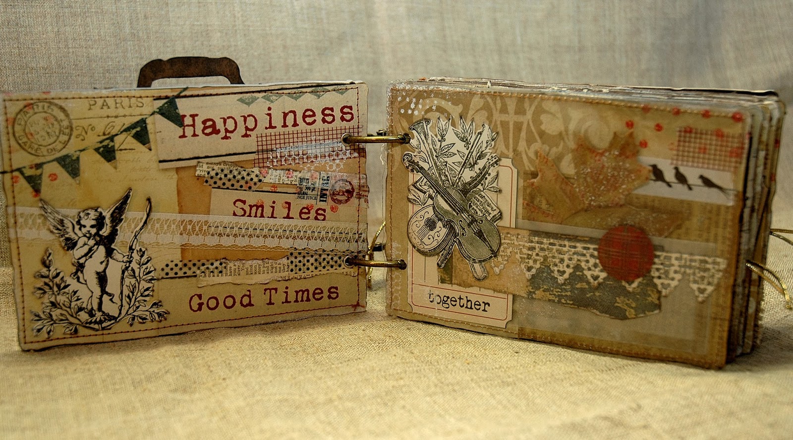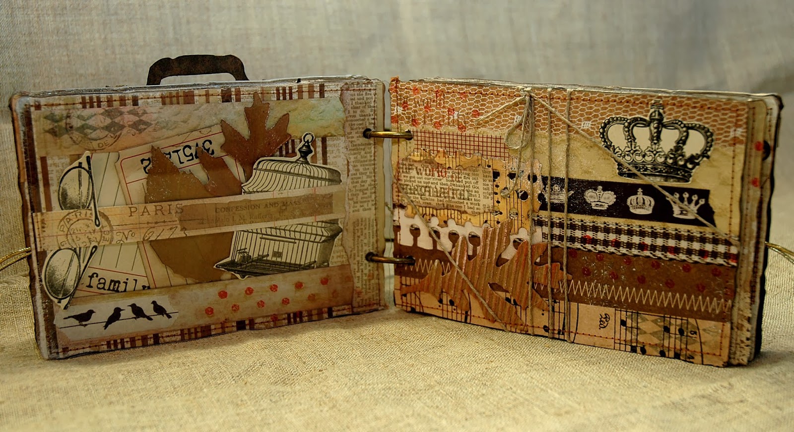 альбом "Чемоданчик воспоминаний" в винтажном стиле. Он предназначен для моих старых чёрно-белых фотографий разного формата, от маленьких (на паспорт) до средних, напечатанных собственноручно ещё в советские времена. Альбом имеет размер 15см на 10,5см. на 9 разворотов. В каждый разворот дополнительно вставлена страница или тег из прозрачного пластика, так что количество разворотов можно сосчитать и как 18. На прозрачной странице также планируется разместить с двух сторон фотографии одинакового размера, пристрочив их на машинке. Страницы вырублены из картона с помощью ножа Тима Хольца и обклеены с двух сторон бумагой DCWV "The Heirloom Stack".