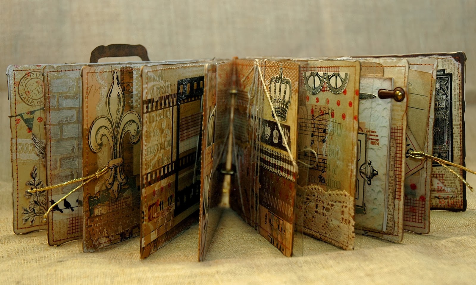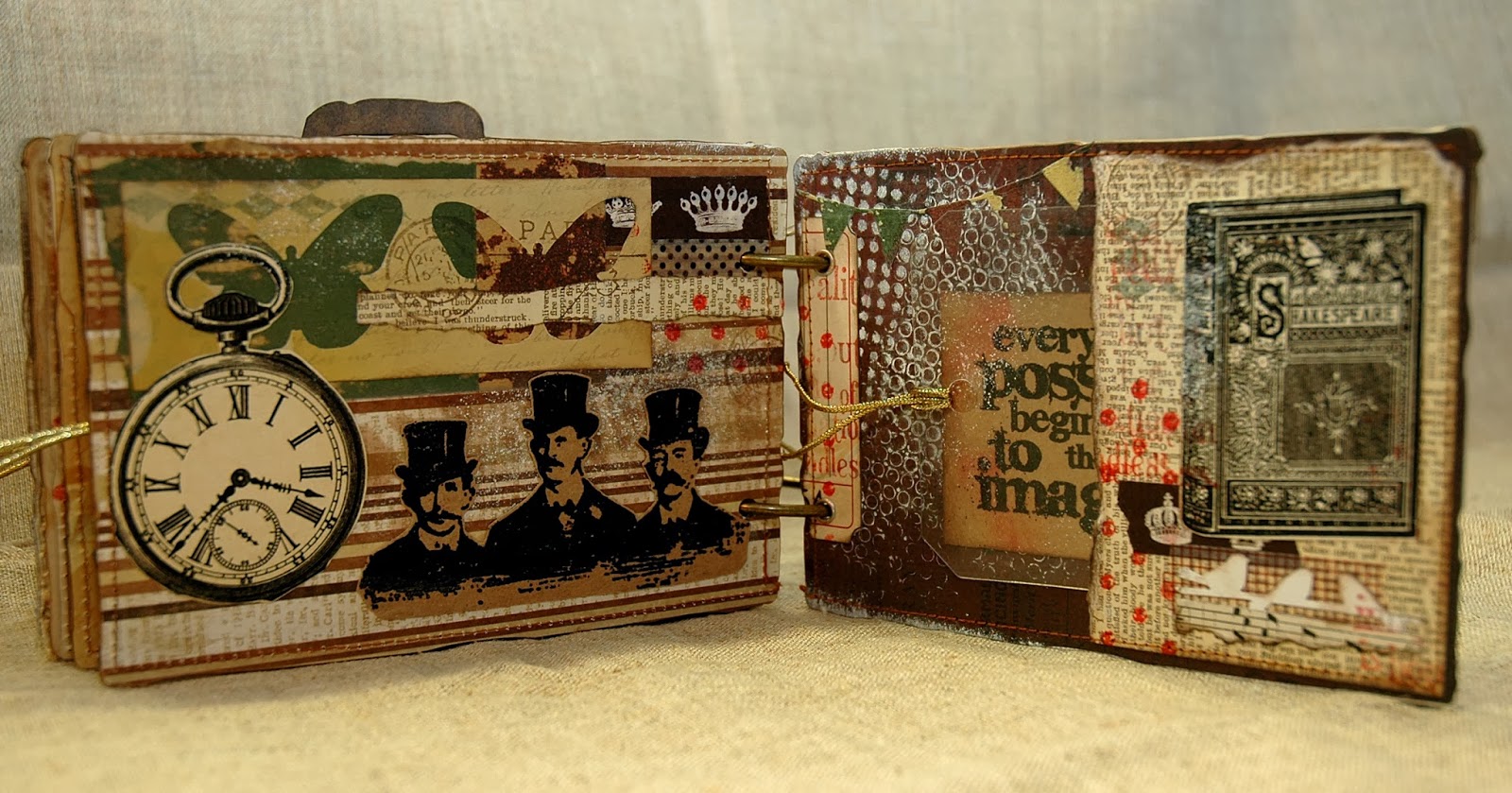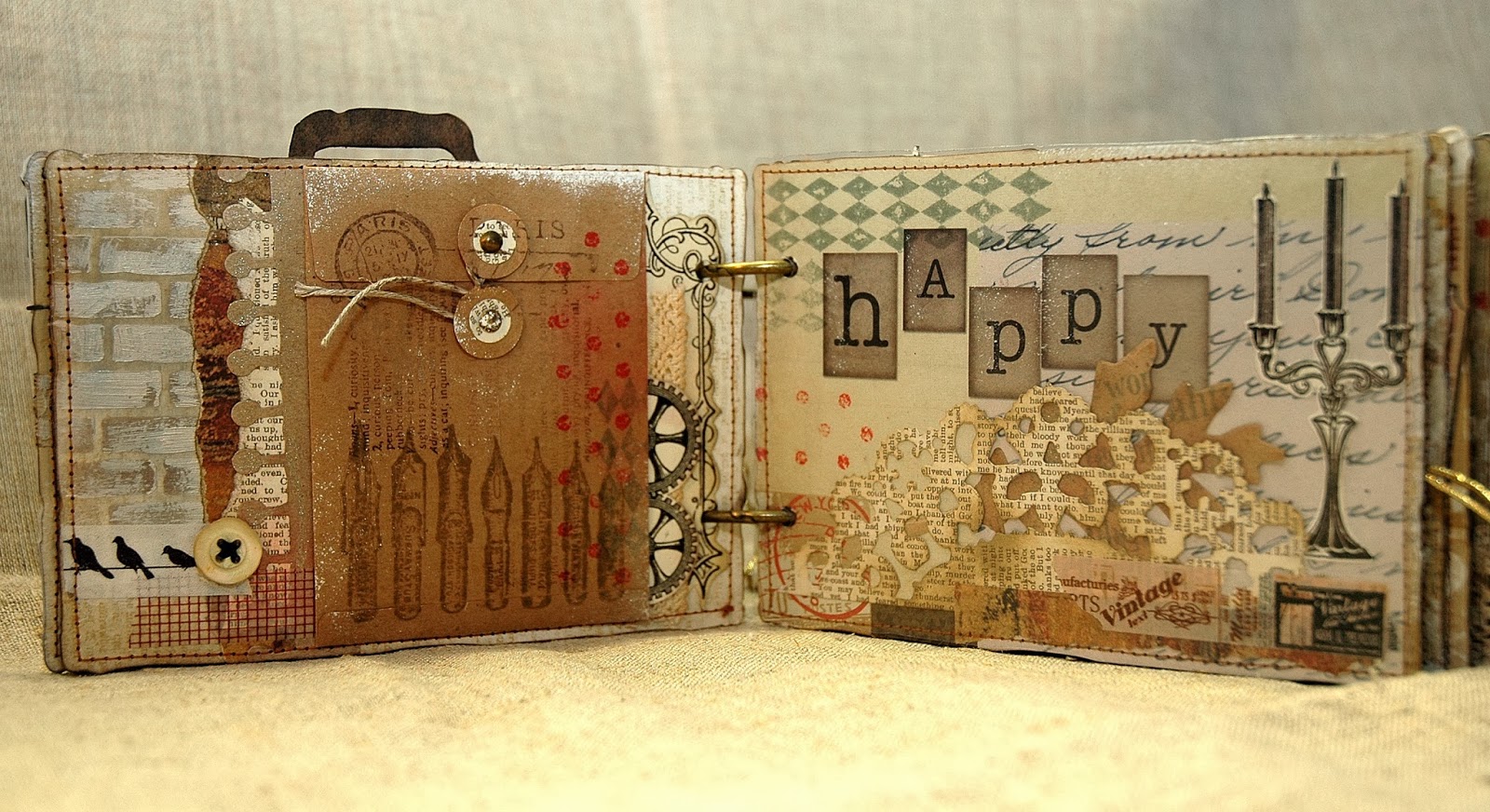 альбом "Чемоданчик воспоминаний" в винтажном стиле. Он предназначен для моих старых чёрно-белых фотографий разного формата, от маленьких (на паспорт) до средних, напечатанных собственноручно ещё в советские времена. Альбом имеет размер 15см на 10,5см. на 9 разворотов. В каждый разворот дополнительно вставлена страница или тег из прозрачного пластика, так что количество разворотов можно сосчитать и как 18. На прозрачной странице также планируется разместить с двух сторон фотографии одинакового размера, пристрочив их на машинке. Страницы вырублены из картона с помощью ножа Тима Хольца и обклеены с двух сторон бумагой DCWV "The Heirloom Stack".