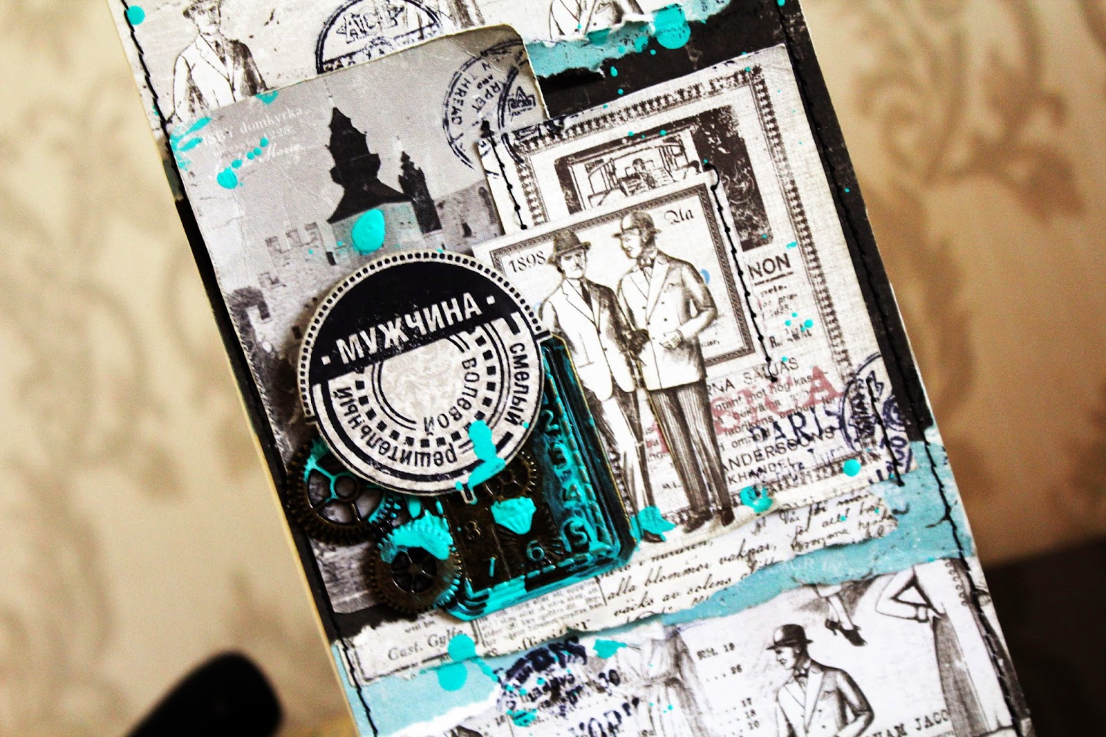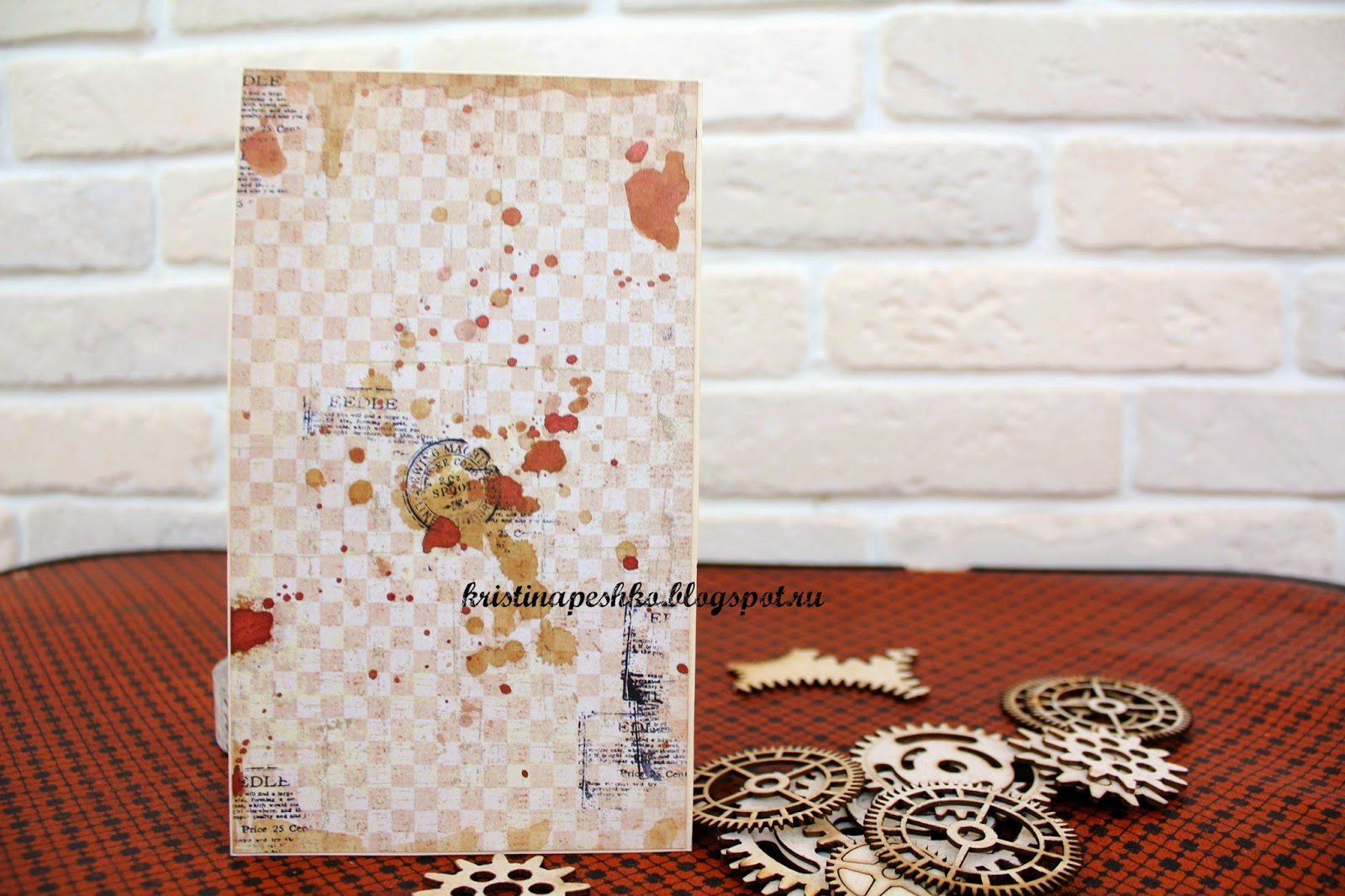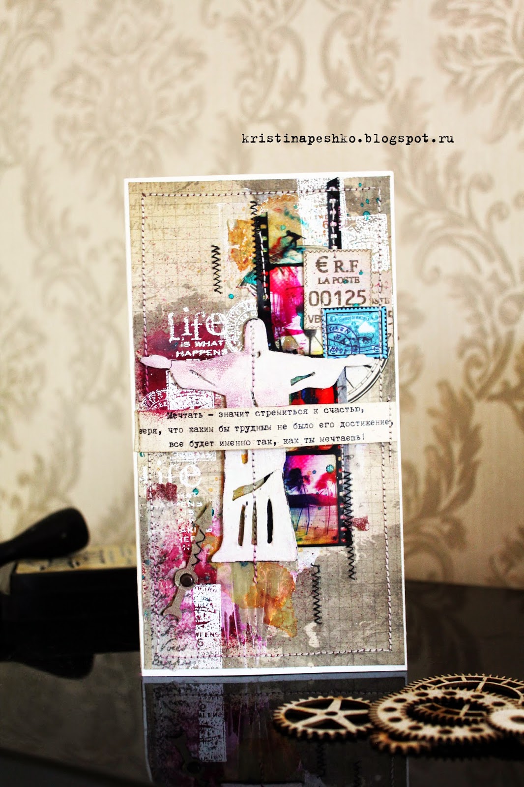 А это родилась из старого чипборда, который валялся и мешался, и вот иногда бывают, что на столе лежат материалы и вдруг рождается вот такая открытка, она сложилось на одном дыхании, тоже мотивация главная идея.