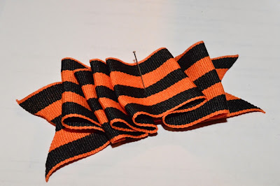 Берем небольшой кусочек ткани и к ней иголками прикалываем Георгиевскую ленту, так, как нам хочется и нравится, левый конец я сразу обрезала флагообразно и обработала огнем, чтобы ткань не сыпалась. Не пугайтесь лежащюю внизу ткань,мы ее потом обрежем.
