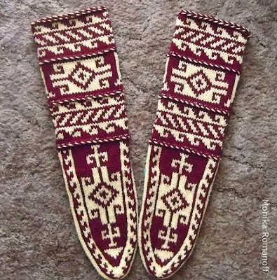 В правильных, старинных, классических узорах не бывает длинных протяжек, там все сбалансировано, смена цвета происходит максимум через 5-6 петель, это - предел. Если больше 5-6 петель, то протянутые сзади нитки приходится дополнительно укреплять, иначе нога будет их цеплять. А укрепленные нитки - это не камильфо, это от скудости мысли дизайнера. Укрепленных ниток в хороших узорах не должно быть!