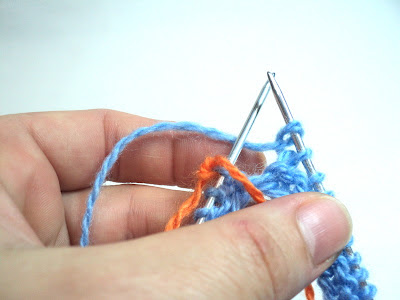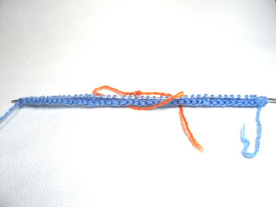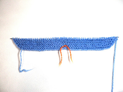 Затем начинаем вязать зубчики ниткой другого цвета. Для этого провязываем 3 ряда чулочной вязкой, начиная с лицевой стороны работы.