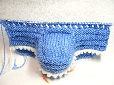 Далее вяжем подошву 8 рядов платочной вязкой, прибавляя в каждом лицевом ряду 4 петли( 1после первой петли, по1 до и после центральной петли и 1 перед последней петлей). Это делается для того, чтобы подошва была овальная, прибавки делаем перекрещенной петлей, чтобы не было дырочек.