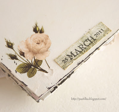 7. Выбрав салфетку с розами- вырежьте мотив и нанесите на заготовку в технике декупаж. По желанию добавьте тени при помощи краски или пастели. вокруг фрагмента .