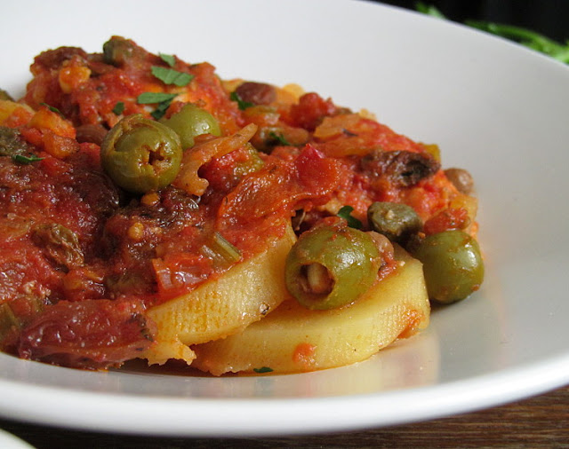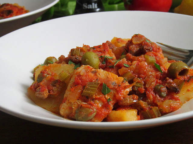 Вкуснейшее рыбное рагу с богатым средиземноморским вкусом! Удивительное сочетание простых продуктов с пикантностью каперсов, оливок, анчоусов и пряных трав))) В оригинале в этом блюде используется сушеная треска, но можно конечно же приготовить и со свежей рыбкой:) Некоторые ингредиенты могут показаться лишними, например анчоусы, или изюм, но я рекомендую ничего не "выбрасывать", чтобы сполна оценить необычный, но интересный и неповторимый вкус данного блюда. Всех желающих приглашаю к столу!!! Угощайтесь!!!