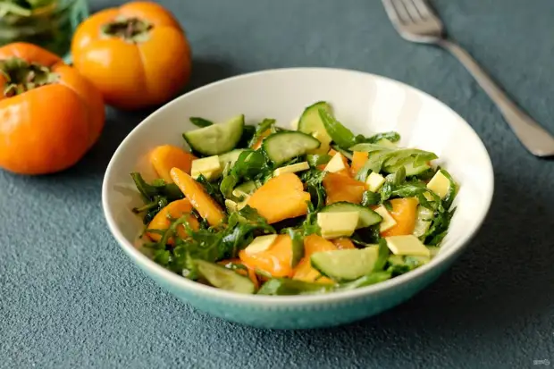 Если вы любите салаты с овощами и зеленью, обязательно попробуйте их в сочетании с хурмой. Получается удивительно вкусно и ярко.