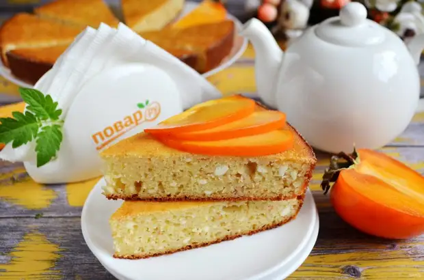 Для взрослых и детей можно испечь классный пирог на кефире с творогом. Хурма придает тесту не только вкус и аромат, но и яркий цвет.