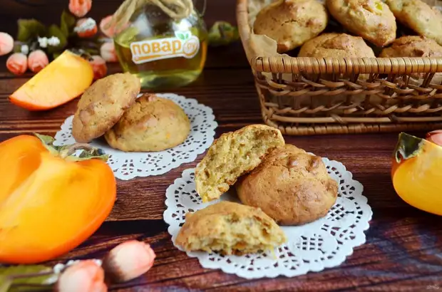 Хурму вымойте, обсушите и очистите. Мякоть порубите мелко или измельчите в блендере. Орехи измельчите в крошку. Яйцо взбейте с сахаром, добавьте размягченное сливочное масло и перемешайте. Выложите хурму и орехи. Всыпьте просеянную муку со специями и разрыхлителем. Перемешайте тесто до однородности. Противень застелите пергаментом. Тесто переложите в кондитерский мешок и отсадите печенье. Отправьте в разогретую до 180 градусов духовку и выпекайте минут 20 до готовности.