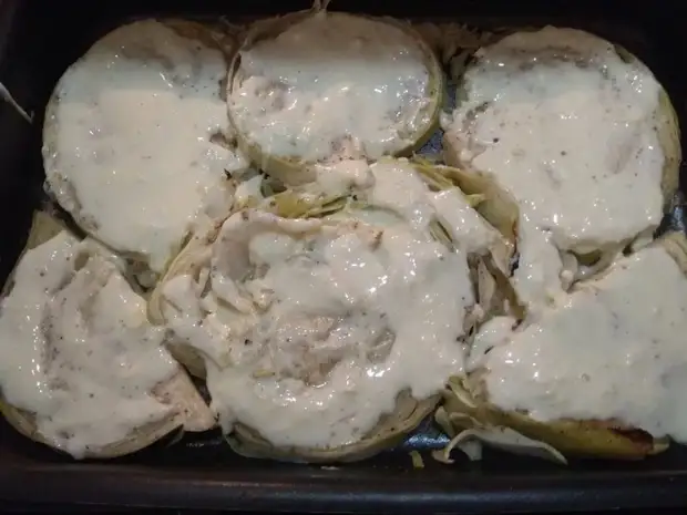 Прикрываем начинку оставшейся частью пластинки баклажана.