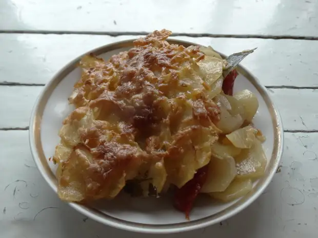 Раскладываем картофель. Стараемся это сделать ровненько в форме рыбьей чешуи.