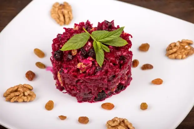 Приготовление. Чернослив и изюм на несколько часов замочите, затем слейте воду и обсушите. Икру нарежьте небольшими кусочками. То же самое сделайте с черносливом. Орехи измельчите. Свеклу натрите на крупной терке. Перемешайте все ингредиенты салата, заправьте его майонезом или растительным маслом и еще раз перемешайте. Выложите на тарелки, используя форму с прессом для выкладки салата.