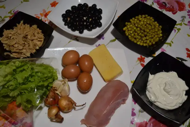 Для приготовления понадобится куриная грудка, яйца, грецкие орехи, ананасы, сыр и майонез. Можно смешать все ингредиенты или же выложить слоями с помощью специального сервировочного кольца.