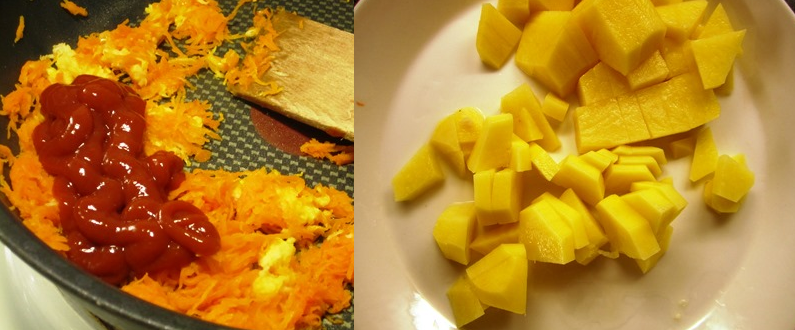 Дали ему стечь, и добавили оставшиеся морковь и перец. Перемешали. Пусть немого остынет.