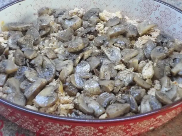Мелко нарежьте грибы и лук, обжарьте их на растительном масле. Дождитесь, пока они остынут, и добавьте измельчённый сыр и рубленую кинзу. Перемешайте начинку, посолите и поперчите.