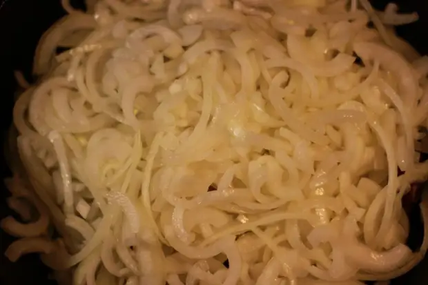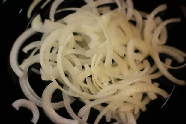 В принципе не имеет значения как резать лук для этого блюда - в процессе приготовления он практически полностью растворившись, превратиться в соус, но я предпочитаю полукольца - так красивше :)