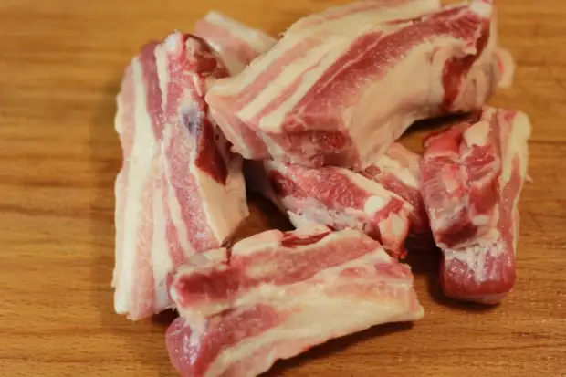 Разогреем на огне "выше среднего" казан или толстостенную сковородку и будем обжаривать наши ребрышки до красивой золотистой корочки. И никакого дополнительного масла - жира класть не нужно, все что нужно вытопиться из грудинки.