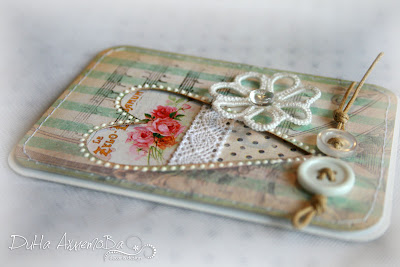 Чтобы розочка не смотрелась слишком одиноко на сердечке, добавим отштампованный французский текст. Четкий оттиск не совсем подойдет здесь. Окунув штамп в чернильную подушечку, с помощью влажной салфетки сотрем лишние чернила, оставляя только необходимую для отштамповки область. Прикладываем к сердечку.