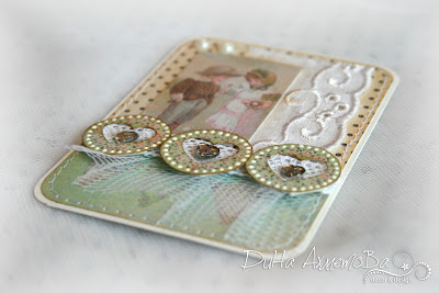 Для украшения карточек я использовала: пуговки, бумагу из коллекции MF, вязаные цветочки, вощеный шнур, кружево, штампы, самодельные цветочки, капельки росы, половинки жемчужин, гипсовые украшения.