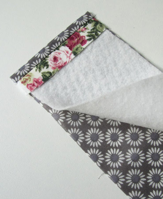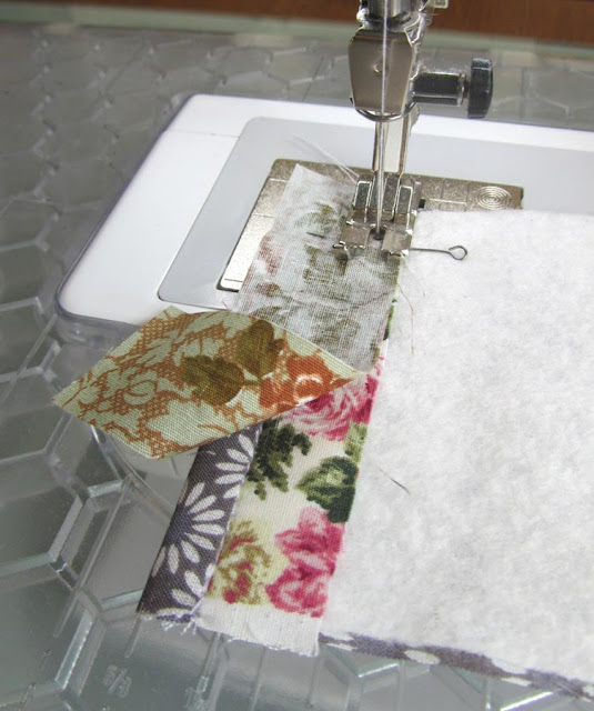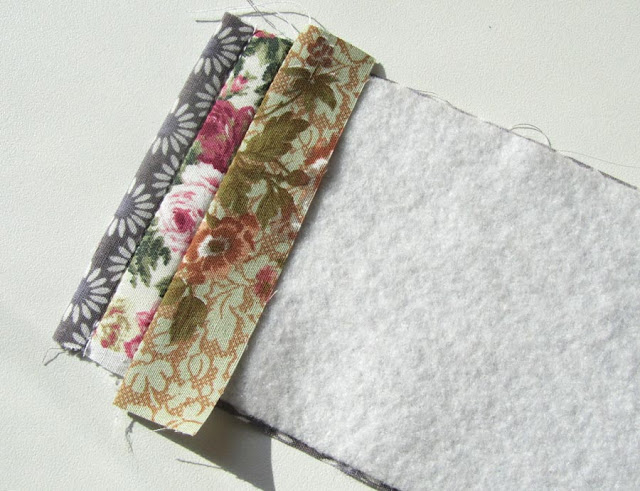 4. На иглопр.полотно накладываем первую полоску ткани лицом вверх, накрываем подкладом изнанкой вверх, срезы уравниваем, скалываем булавками.