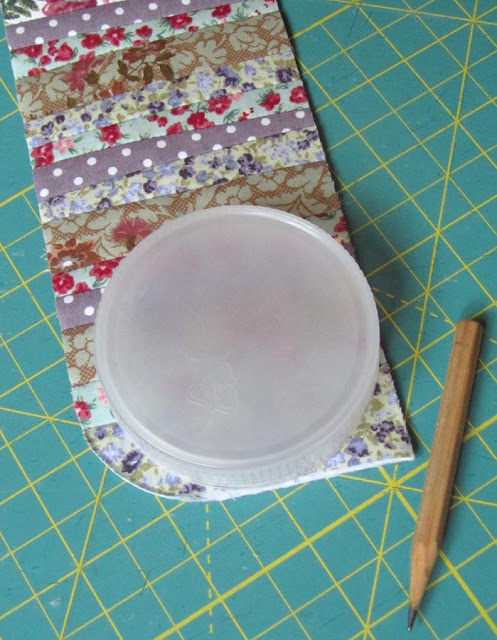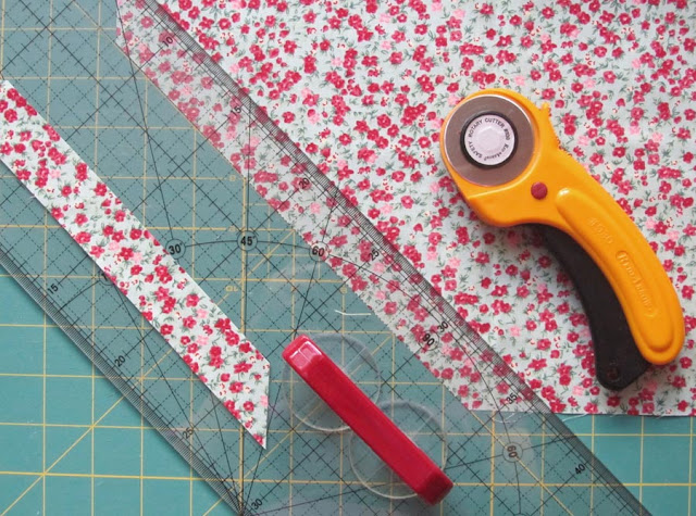 14. Выкраиваем косую бейку ( под 45* ) шир.-3,5 см, длинной равной периметру необработанных + 2 см на подгибку края. Легче это делать на раскройном коврике с помощью линейки для пэчворка и дискового ножа.