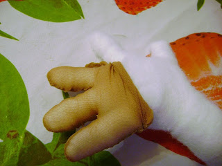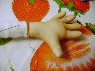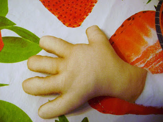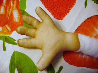 Если у вашей куклы ручка очень большая и не помещается в это пространство,то рамку (как делает Е.Лаврентьева) или пяльцы можно взять больше,но тогда нужно для одной руки использовать два отреза колготки. Разрезать каждый вдоль,сложить их вместе лицевыми сторонами внутрь и прошить с трёх сторон.