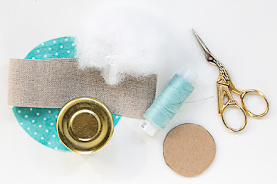 Нам понадобится: металлическая крышечка такого размера, чтобы после обклеивания лентой она легко ложилась на банку, консервная банка, наполнитель, ткань, лента, аксессуары и термопистолет.