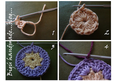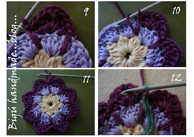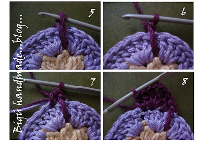 5.-Threaded hook into the stitch of the first round (straw yellow), we take the thread and stretch to the lilac top ... 6.-We weave a single crochet stitch (sc) on this loop ... 7.-Now work 1 half double crochet (hdc) on the next point ... 8.-In the nex stitch, work (2 dc-2 chains-2 dc) and the last point of the first group of 4, a crochet knit 1 sc...