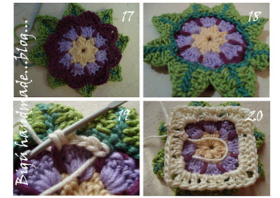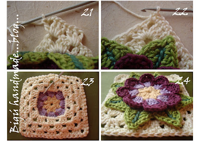 17: Completamos la ronda de hojas y rematamos el hilo... 18.-Por detrás se verá así... 19.- Ahora cambiamos de color para la base del granny square, ensartamos el hilo y tejemos una vuelta de 4 cadenas , fijando en cada lazada (morado) con un punto deslizado... 20.-Para formar el cuadrado tejemos: 3 puntos altos, para formar la esquina son( 3 puntos altos- 2 cadenas- 3 puntos altos), repetimos hasta terminar...