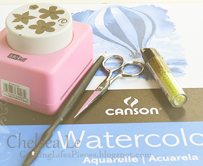 | Materials: 5 petal flower punch, watercolor paper, scissor, small ballpoint stylus, and micro glass beads. | |