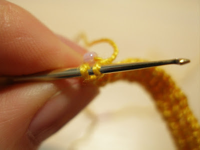 Обращаю ваше внимание, что бисеринка оказывается СЗАДИ вязания, то есть весь бисерный рисунок окажется на изнаночной стороне. После накида вытягиваем петлю, чтобы дальше провязывать СТ. С Н. Смотрим сверху - бисеринка ЗА работой.