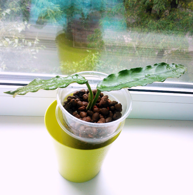 Если на срезе сок не выделяется, режьте выше (так как эти ткани погибли), допустимо даже под самым листовым узлом. Если сок выделяется, смойте его теплой водой, обсушите и обмакните срез в порошок корневина. Обработанный черенок поместите в сухой прозрачный пакет на 2-3 дня, после этого укореняйте в стакане с вермикулитом, как описано выше. При посадке для устойчивости черенка, возможно, придется заглубить черешки нижних листьев, это не страшно, но учтите— увлажнять вермикулит нужно минимально. Стаканчик с черенком поставьте в пакет и держите в теплом светлом месте. Корни могут появиться нескоро — через несколько месяцев — запаситесь терпением. К сожалению , полной гарантии, что черенок укоренится, нет.