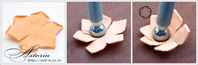 Четвёртую, пятую и шестую детали подкрутить и на мягком коврике придавливать, как бы прокатывая инструмент от центра до середины лепестков. При этом лепестки сами закладываются в одном направлении. ( Вместо специального инструмента пробовала использовать колпачок от лака для ногтей - ничем не хуже).