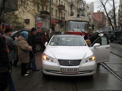 На днях в Киеве по улице Дмитриевской было практически полностью заблокировано движение. Девушка на Lexus с харьковскими номерами припарковалась на трамвайных путях в двух шагах от тротуара.
