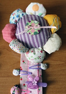 Основу из ДВП и поролона обтянула тканью, предварительно пришив кармашки на резинке. В кармашки можно поместить объемные резинки, расческу, спрей для более лёгкого расчесывания волос...
