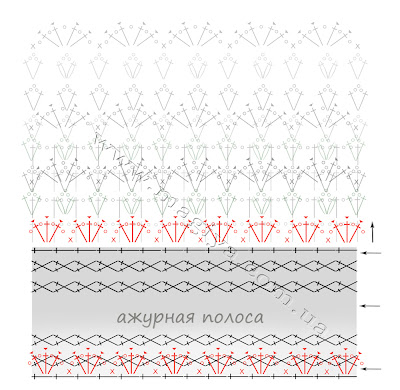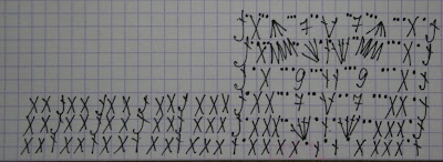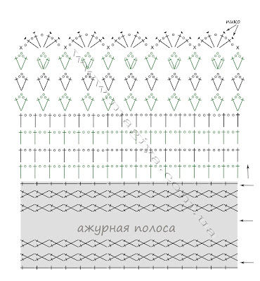 Рюшки ниже каймы (где я обсчиталась и наврала) По этой схеме вязала перекрещенные столбики: Я вытачку не делала, а нужно бы. Информация на будущее: ДВОЙНАЯ ВЫТАЧКА. |