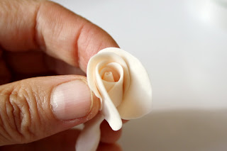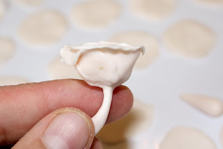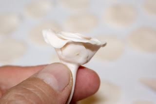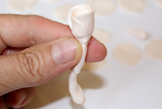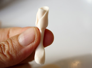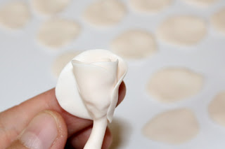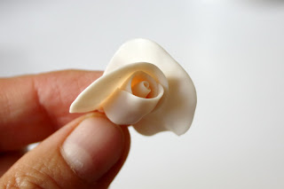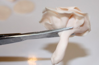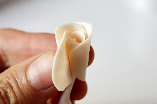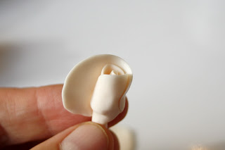 Лепески зубочисткой приплющиваем возле края, чтобы не видно было толщины среза. Вот как раз в этом место тонкий слой так и норовит некрасиво вылезти. Сначала два темных лепестка: