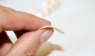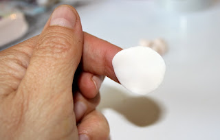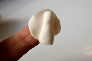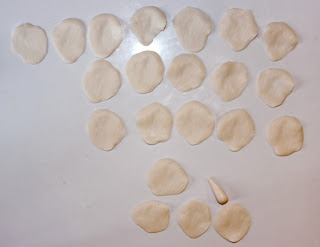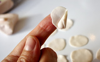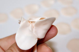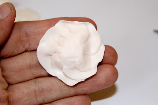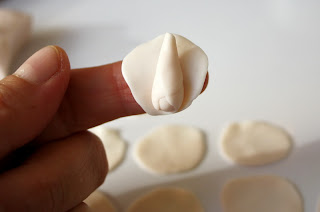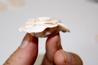 Например, сделать колечко или серьги, или даже букет цветов. Отрезаем лепестки острым ножом. Небольшой кусочек основного цвета используем в качестве основы, в центре делаем небольшую выемку мизинцем: