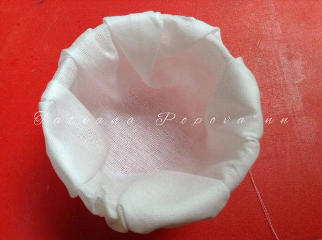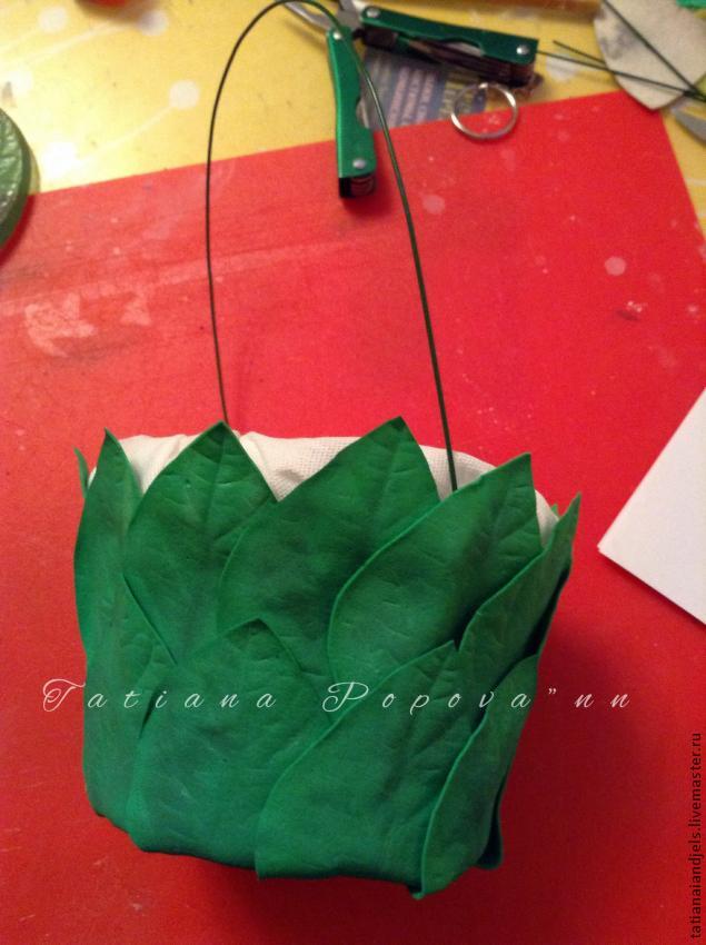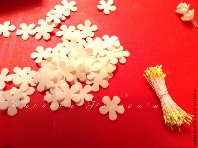 в) Складываем три круглых листочка и тычинки вместе, обматываем ниткой.