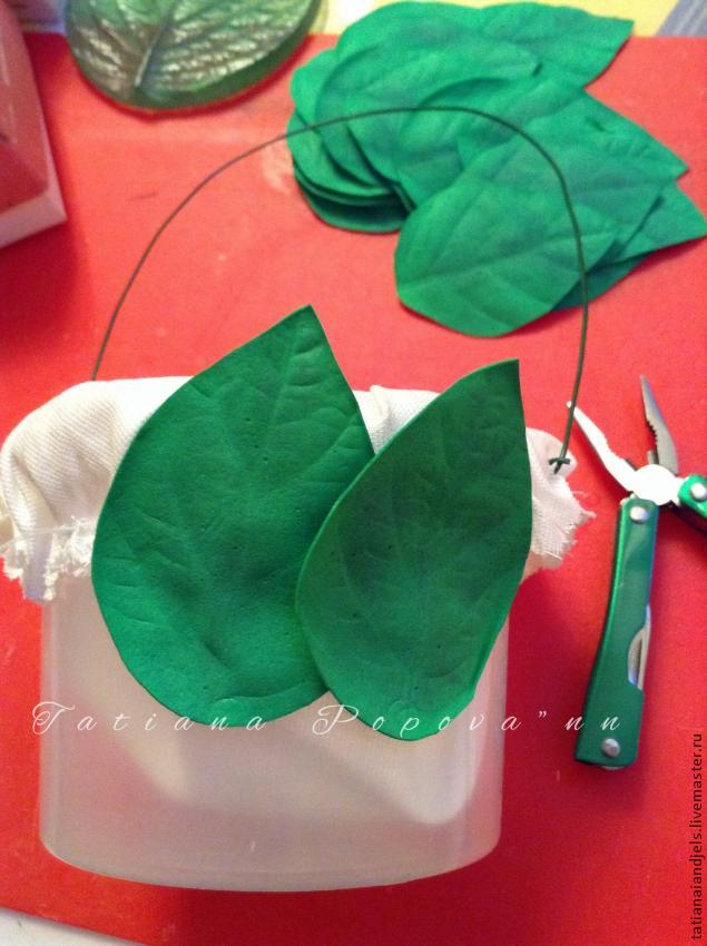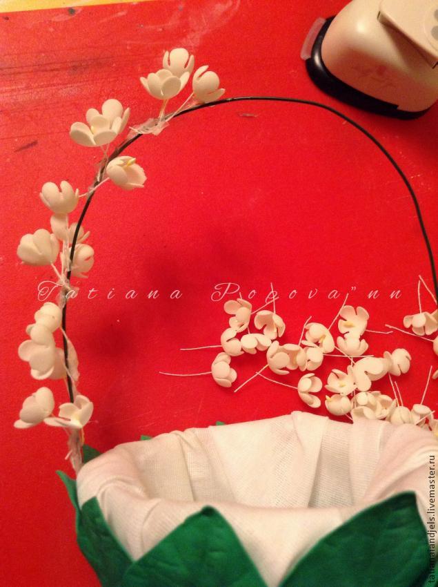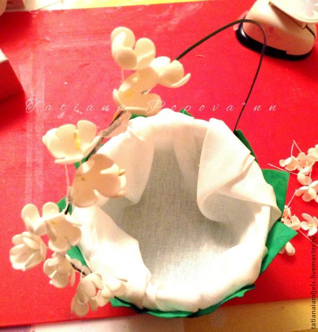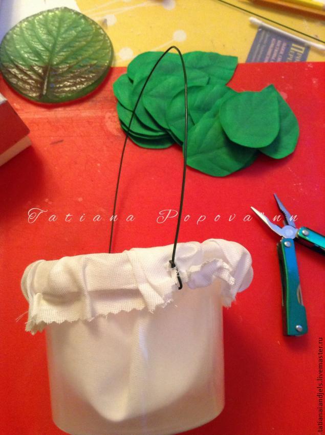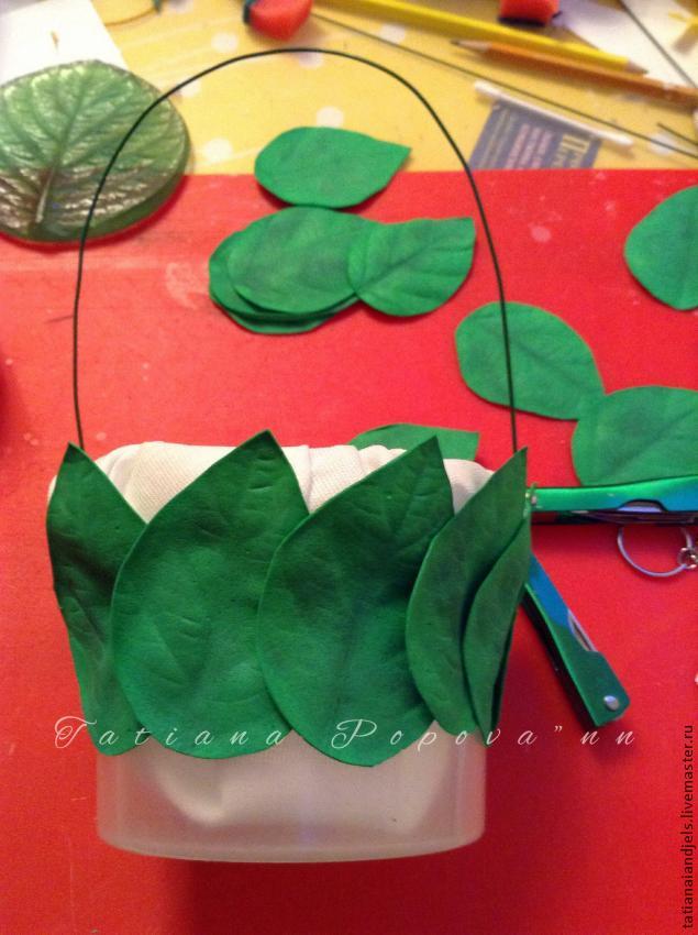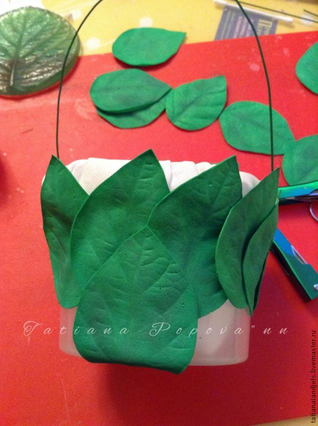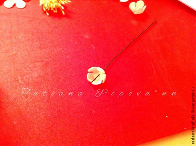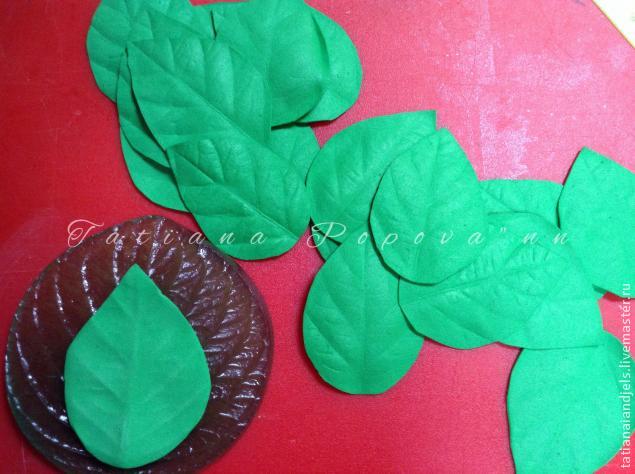 15. Вставляем в дырочки цветы и листья, с изнаночной стороны перекручиваем проволочки между собой. Изнаночную сторону заклеиваем кругом из ватмана.